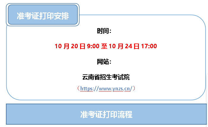 2021年10月20日9:00起,考生可登錄云南省招生考試院網(wǎng)站打印準(zhǔn)考證。具體操作流程如下: