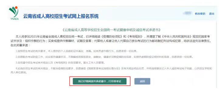 8.考生要仔細(xì)閱讀《云南省成人高等學(xué)校招生全國(guó)統(tǒng)一考試健康申明及誠(chéng)信考試承諾書》,點(diǎn)擊“我已仔細(xì)閱讀并承諾遵守,打印準(zhǔn)考證”按鈕。