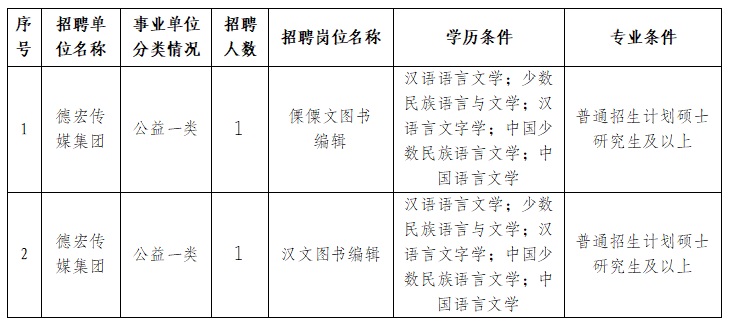 德宏傳媒集團(tuán)音像出版中心傈僳文圖書編輯崗位