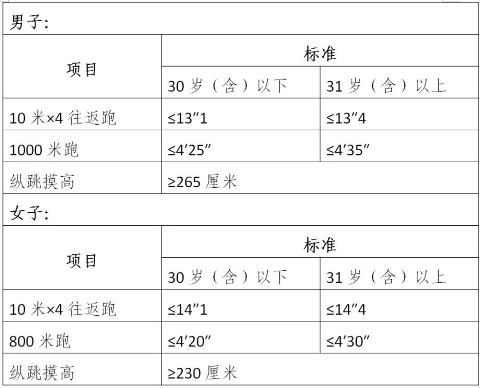 其標(biāo)準(zhǔn)按照招錄人民警察標(biāo)準(zhǔn)(人社部發(fā)〔2011〕48號)執(zhí)行,達(dá)不到以下標(biāo)準(zhǔn)的視為體能測評不合格。體能測評標(biāo)準(zhǔn)為: