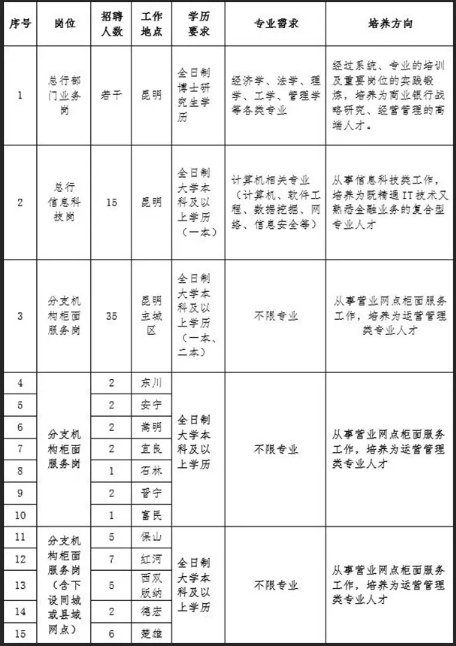富滇銀行倡導(dǎo)和堅(jiān)持“以人為本”的人才理念,積極為應(yīng)屆畢業(yè)生提供有競爭力的薪酬、完善的福利、專業(yè)的培訓(xùn)體系、廣闊職業(yè)晉升通道和發(fā)展平臺。根據(jù)業(yè)務(wù)發(fā)展需要,富滇銀行啟動2019年校園招聘,現(xiàn)將有關(guān)事項(xiàng)公告如下: