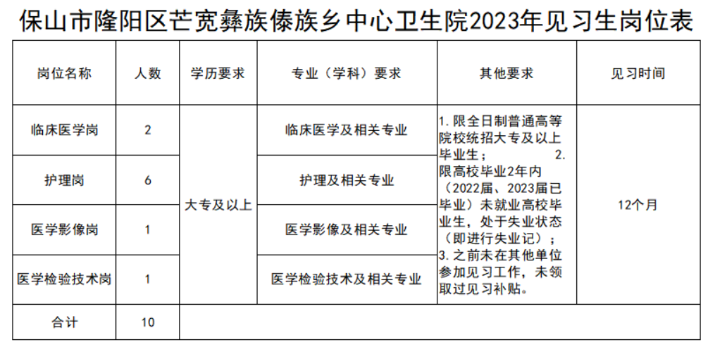 保山市隆陽區(qū)芒寬彝族傣族鄉(xiāng)中心衛(wèi)生院2023年見習(xí)生崗位表