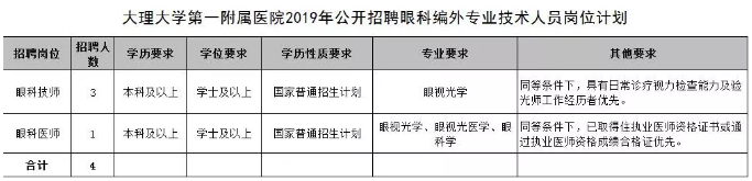 因工作需要,大理大學第一附屬醫(yī)院眼科面向社會公開招聘編制外專業(yè)技術(shù)人員4名,現(xiàn)將有關(guān)招聘事宜公告如下: