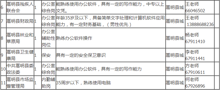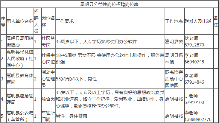 招聘具體事宜請(qǐng)咨詢(xún)用人單位,符合公益性崗位上崗條件的個(gè)人也可以到嵩明縣勞動(dòng)就業(yè)服務(wù)局綜合科申請(qǐng)公益性崗位求職登記,詳詢(xún)陳老師:0871-67917444。