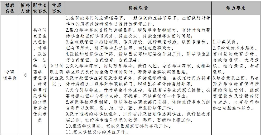 為適應(yīng)學(xué)校發(fā)展的需要,2020年我校面向社會(huì)公開(kāi)招聘專職輔導(dǎo)員6名,現(xiàn)將有關(guān)事項(xiàng)公告如下: